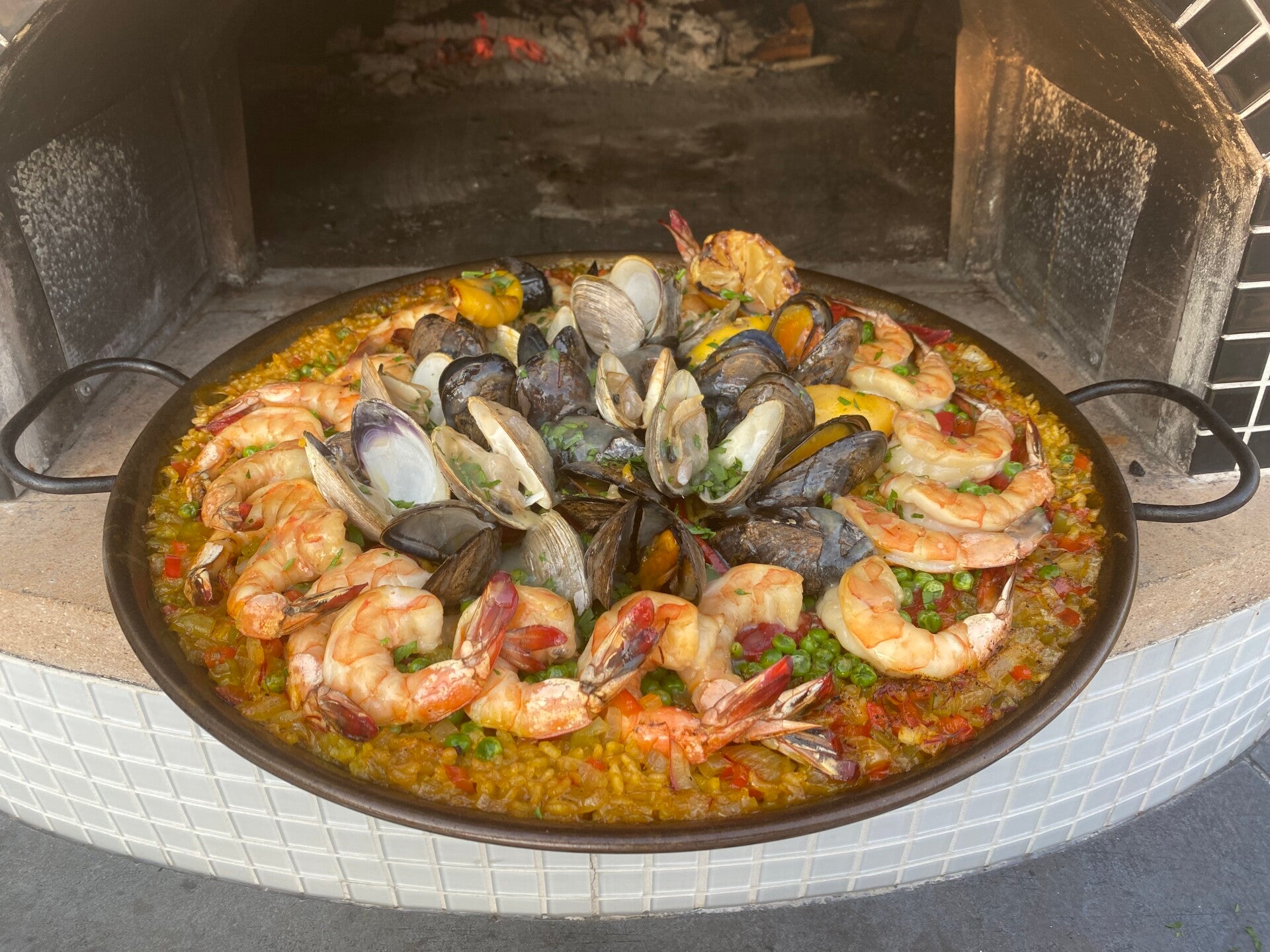 CLASSIC PAELLA perfect in a wood burning pizza oven... bomba rice, saffron, smoky paprika, local chicken, Spanish chorizo, colossal shrimp, fresh peas